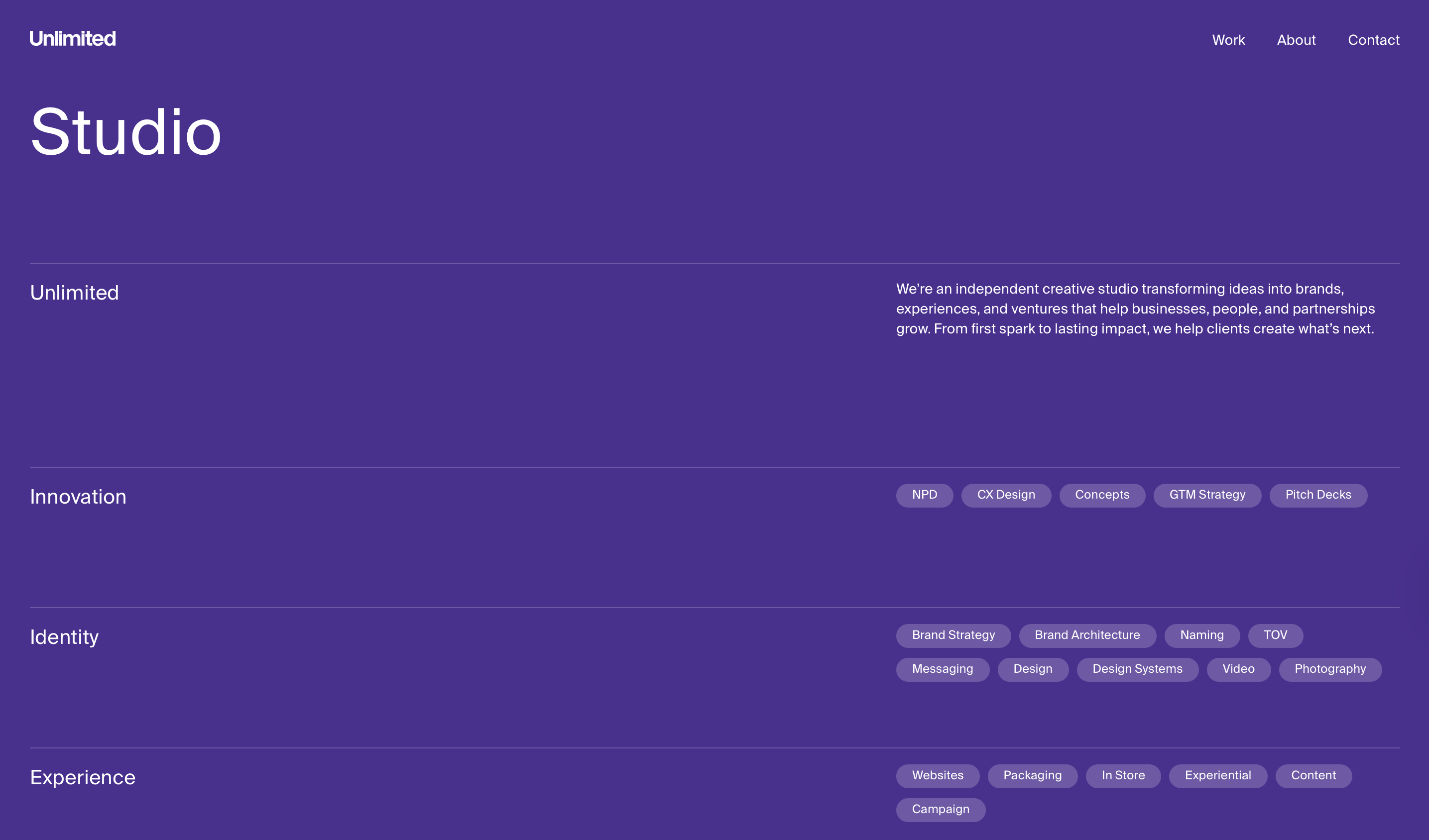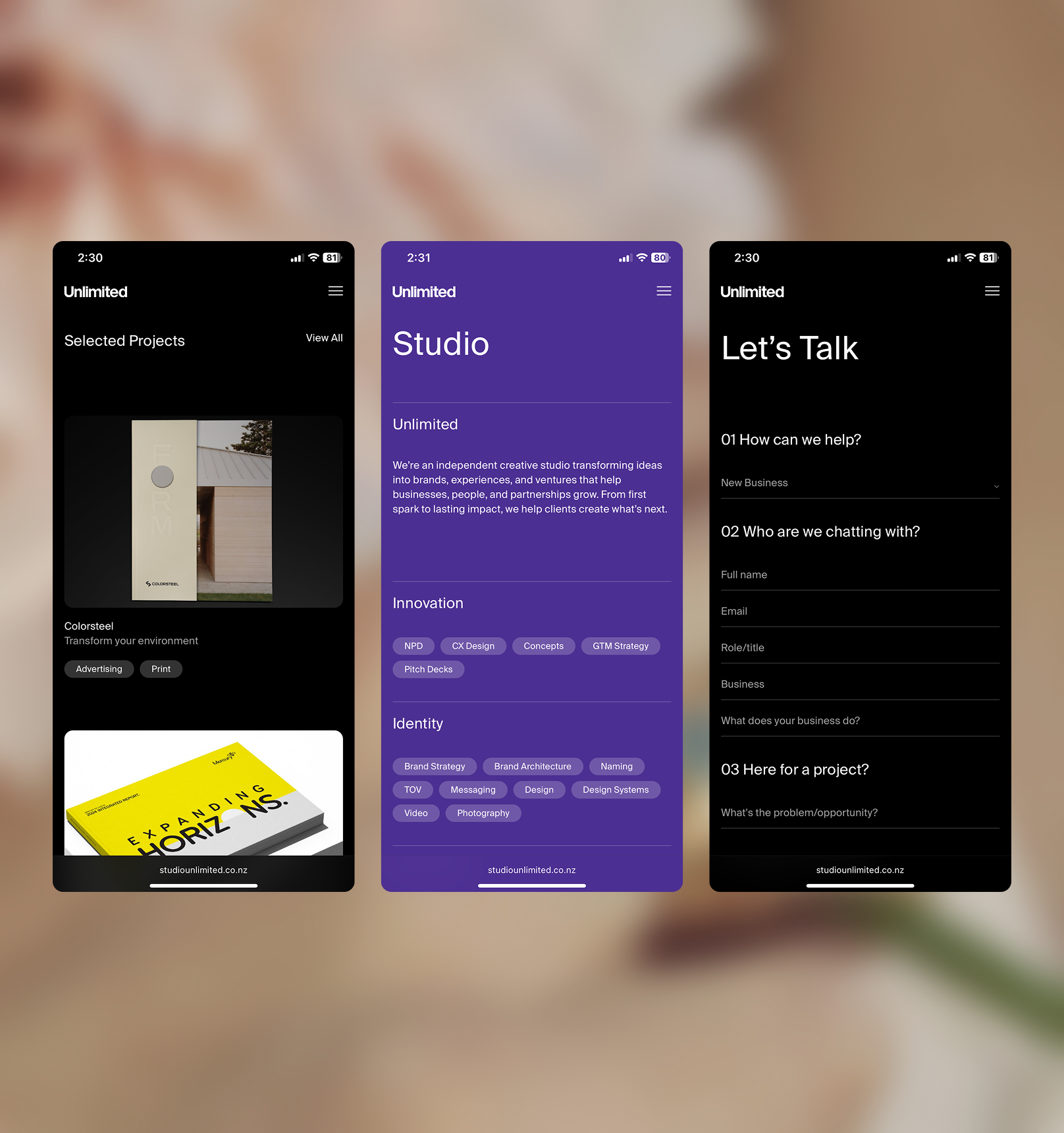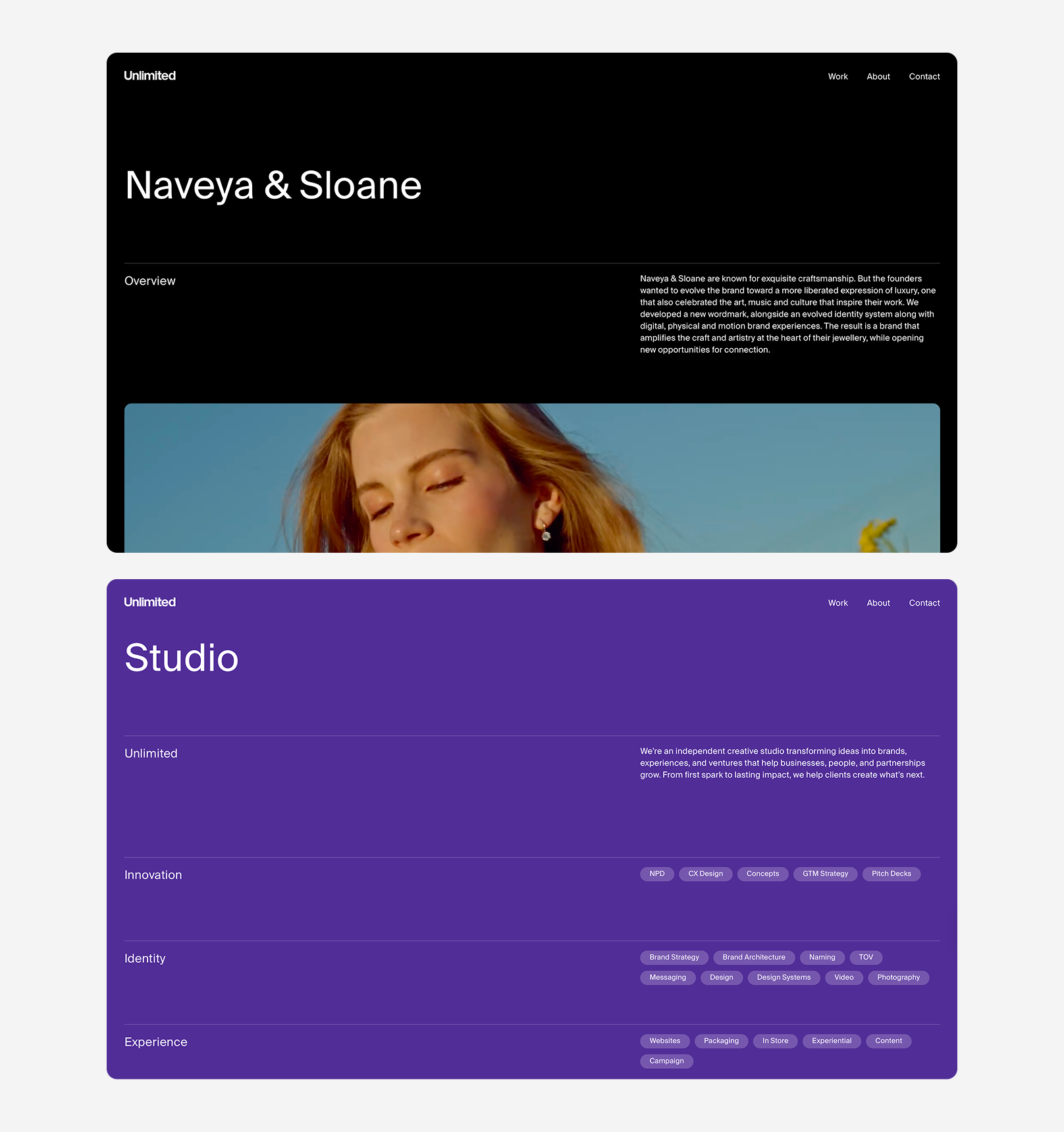 The purpose of this project was to refresh the Studio Unlimited website and create a more polished, engaging digital experience that better reflected the studio’s work, values, and creative approach. This project was a collaborative effort between me and a senior designer at New Territory, where I contributed to early concept development and crafted visual design directions for the updated site.